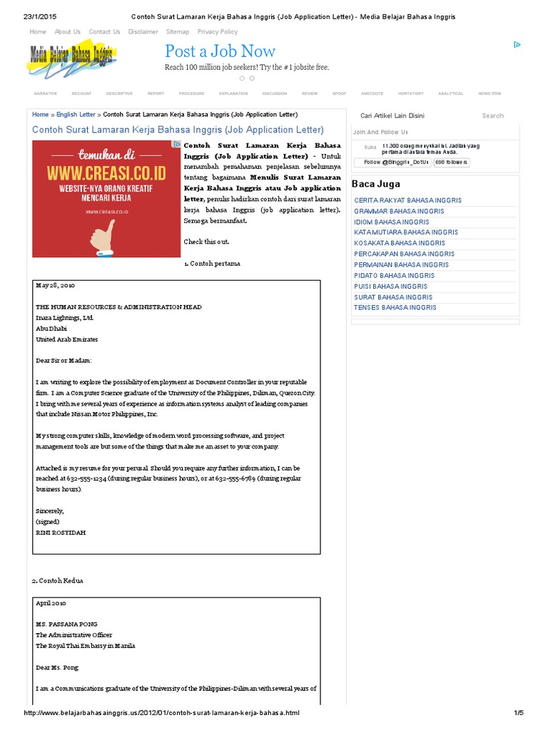 Contoh surat lamaran kerja dalam bahasa inggris, job application letters, surat lamaran kerja dalam bahasa inggris 4 komentar: Memiliki kemampuan berbahasa inggris yang baik secara pasif dan terlebih aktif akan menambah nilai jual seseorang dalam dunia kerja. Contoh surat lamaran kerja cover letter dalam bahasa. Contoh application letter bahasa inggris. Dalam pengajuan lamaran kerja ke perusahaan, surat lamaran adalah salah satu dokumen yang wajib dilampirkan. Berikut adalah contoh surat lamaran kerja (job application letter): Setelah mendapatkan informasi yang saya dapatkan di surat kabar sebagai apoteker di perusahaan anda, maka saya menulis surat lamaran ini untuk posisi staff apoteker. Saya memiliki pengalaman kerja selama 2 tahun di industri farmasi, dan saya telah bekerja dengan berbagai pengalaman sebagai staff apoteker di perusahaan a. Contoh surat lamaran kerja (job application letter) dalam bahasa inggris terbaru lengkap dengan terjemah. Berikut ini adalah contoh application letter dalam bahasa inggris dan artinya. Apakah kamu sedang mencari contoh surat lamaran kerja bahasa inggris cover letter misalnya karena ingin melamar kerja ke perusahaan multinasionalmeskipun proses mencari pekerjaan sudah terjadi sejak lama namun tak banyak orang yang dapat membuat surat lamaran pekerjaan yang baikhal ini karena kurangnya pembekalan bagi mahasiswa dalam hal persiapan untuk melamar pekerjaan ke sebuah. Hanya saja, biasanya jika berbicara tentang application letter, maka surat lamaran tersebut ditulis dengan bahasa inggris. Namun, yang perlu diperhatikan di sini adalah isi dari pada surat itu sendiri, sebab untuk bentuk surat, tidaklah jauh berbeda dengan surat lamaran pekerjaan dalam bahasa.